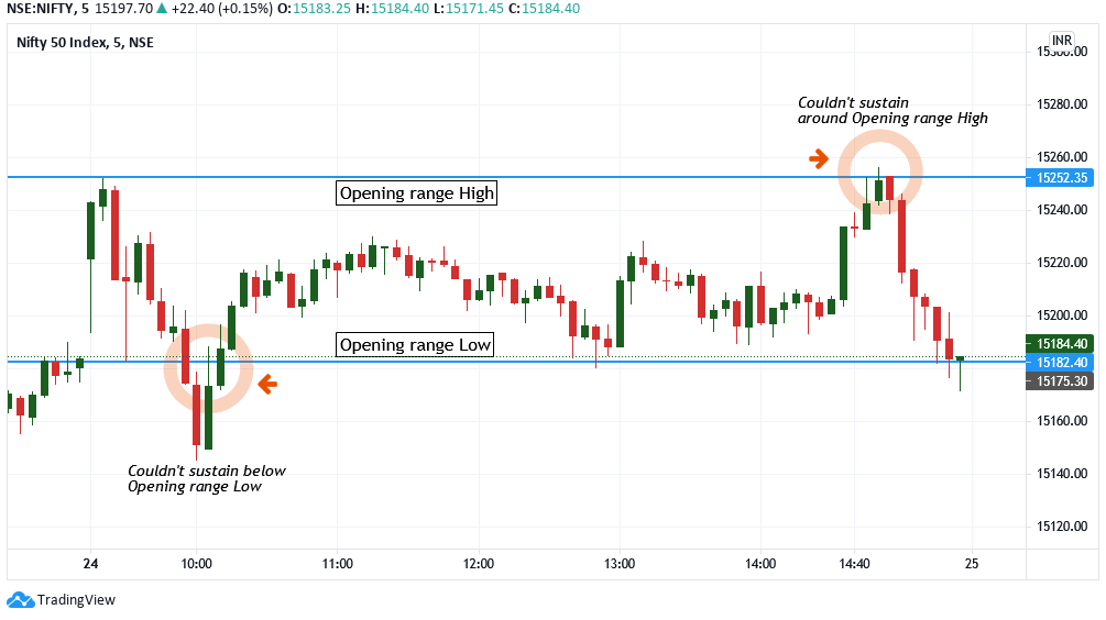 The price couldn’t sustain below opening range low and retraced from opening range high after briefly crossing above opening range high.
